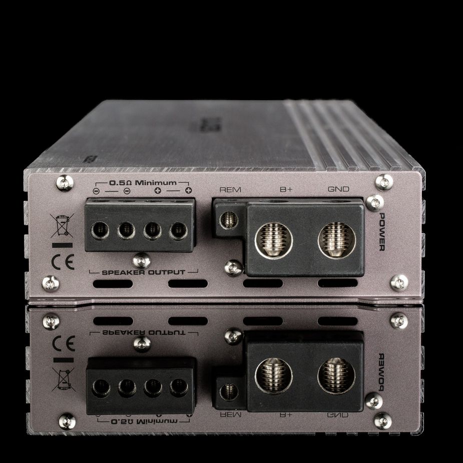 If even more output power is desired, two RC 3200c1 amplifiers can be linked. In this system connection, the output power is doubled and a maximum output power of almost 6400 Watts (1 Ohm) can be retrieved.