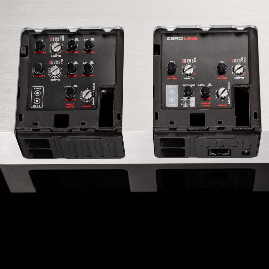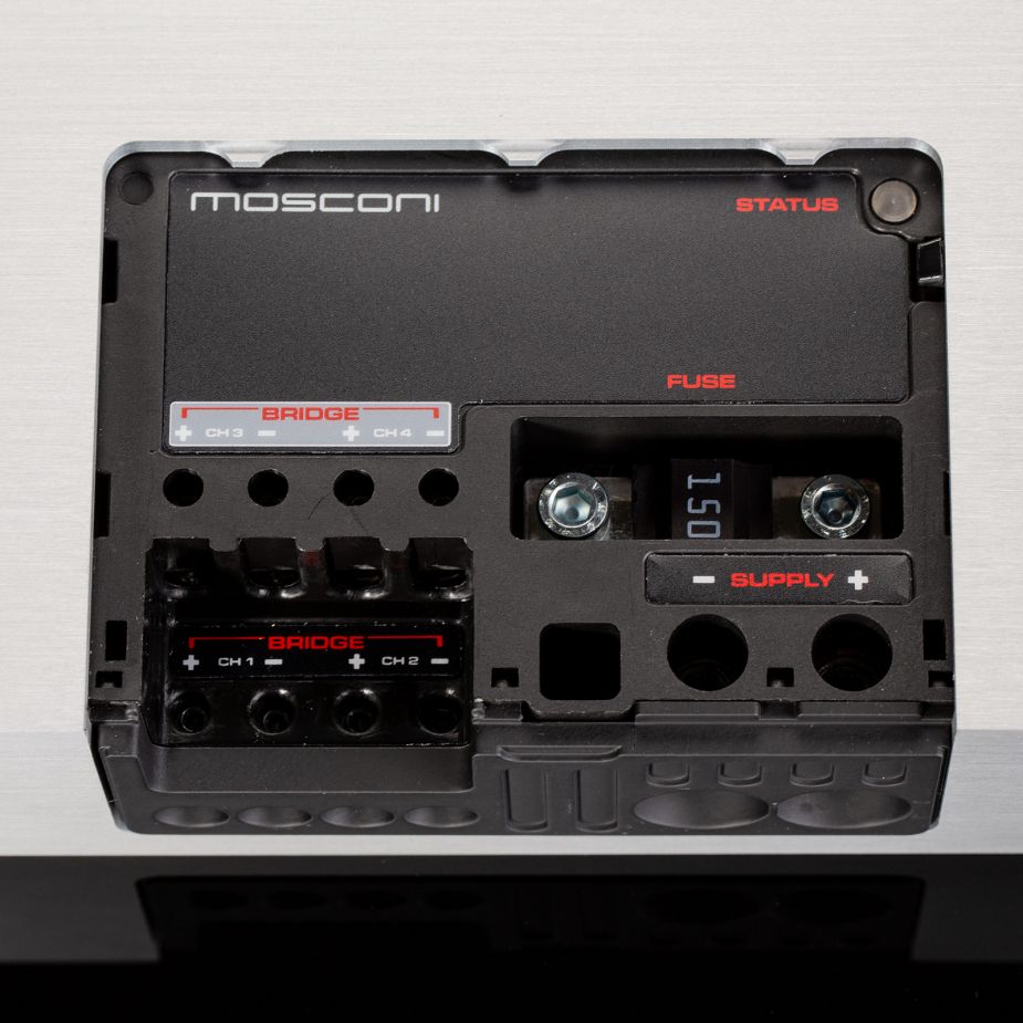 The MOSCONI Zero 4 amplifier has an asymmetrical output power of 2 x 100 Watts, plus 2 x 210 Watts RMS. This power distribution is optimized for active 2-way speaker operation or a speaker/subwoofer combination. Separate power supplies ensure low "crosstalk" between channel pairs and full power output even at maximum demands.